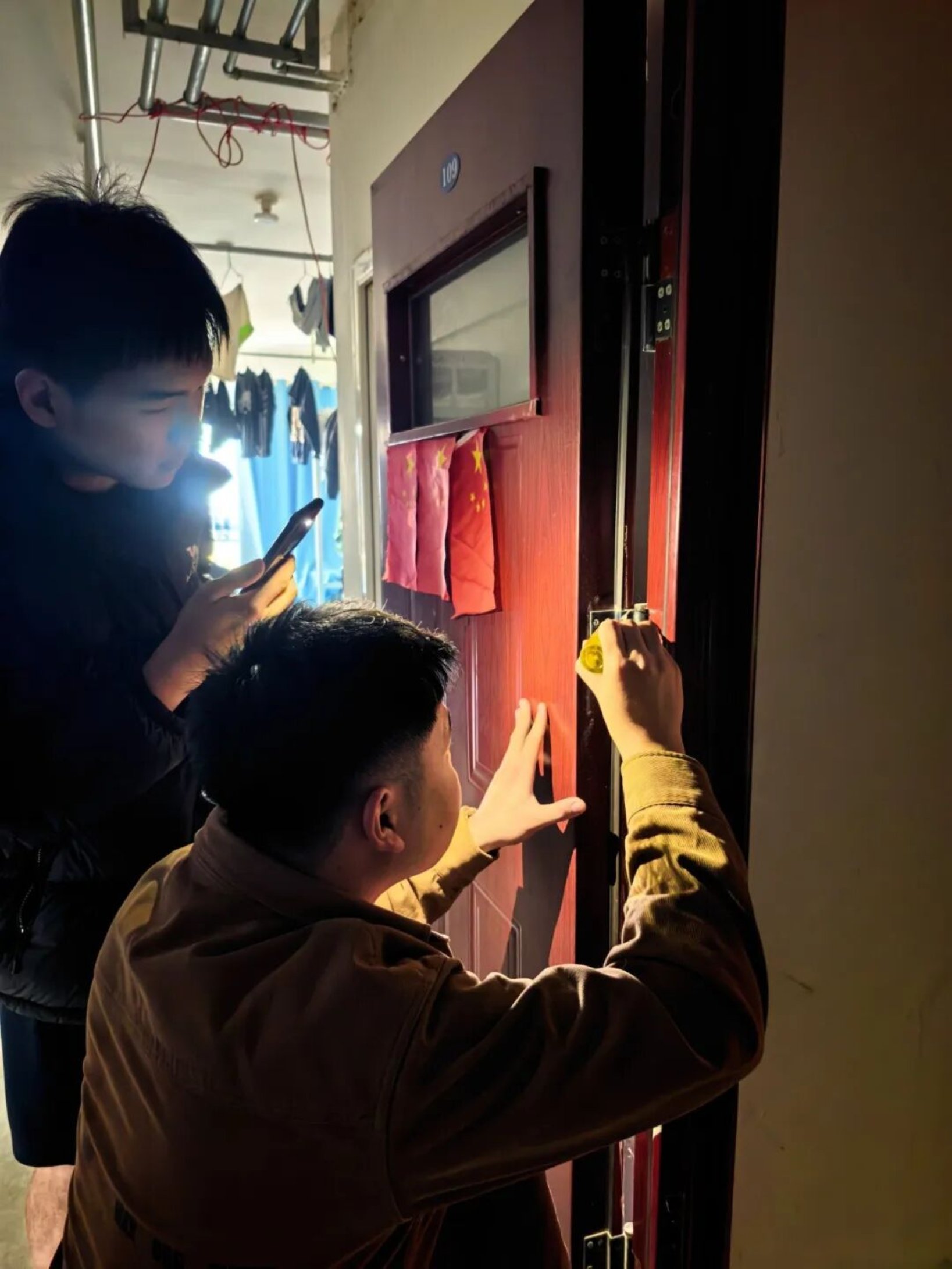 走访过程中,学生干部们化身“便民小使者”,带着提前准备好的润滑油、抹布等工具,逐间宿舍敲门问候。“同学,你们宿舍的门开关会不会有异响呀?我们来帮你滴点润滑油~”“抽屉推拉费劲吗?让我们检查一下!”亲切的问候瞬间拉近了距离。