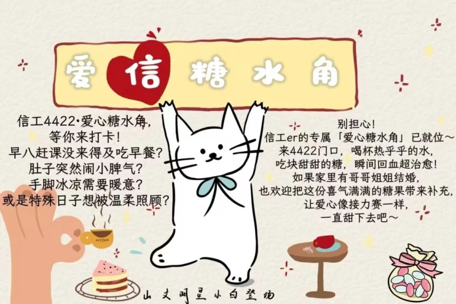 这份甜蜜并非一人独酿,而是信工学子的爱心接力。糖水角的发起者们用心准备着热饮与糖果,为来往的同学送上即时的温暖;同时也欢迎大家把家里喜宴的糖果带来补充,让这份带着喜气的甜蜜不断流转。就像海报里说的,让爱心像接力赛一样,在信工的校园里一直甜下去。